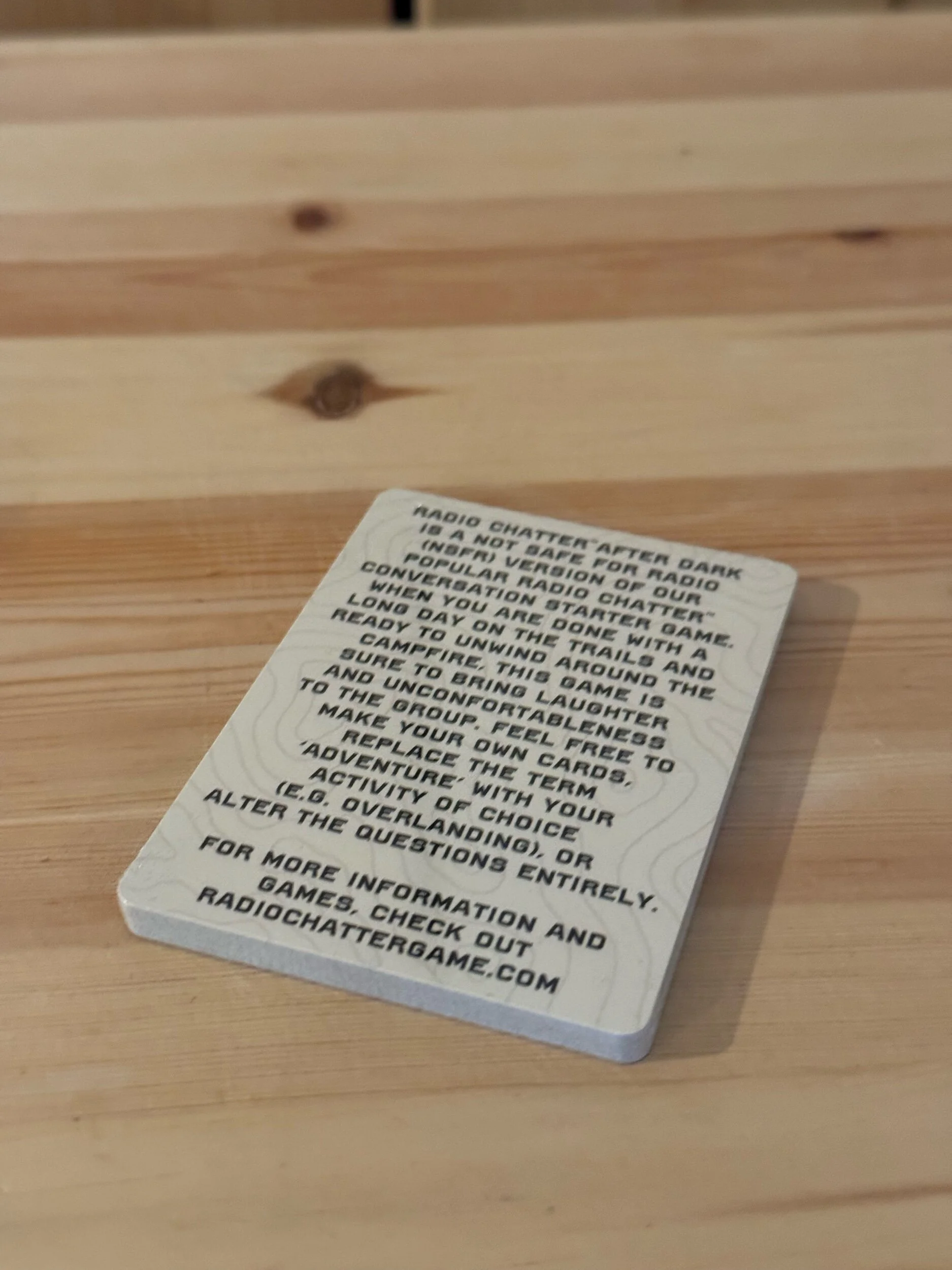 Conversation Starter Game from $15.00 Select Material Regular Water Proof Add To Cart Added! After Dark - NSFR from $10.00 Select Storage w/Hard Storage Case (Gear Hauler) Shrink Wrapped Only (No Storage Case) Add To Cart Added! Radio Chatter Pouch - Made by Blue Ridge Overland Gear $20.00 Add To Cart Added! T-Shirt (Trucks) $35.00 S M L XL 2XL 3XL Add To Cart Added! T-Shirt (Grey Logo) Sale Price: $20.00 Original Price: $35.00 Sale S M L Xl 2XL 3XL Add To Cart Added! Radio Chatter Hat $20.00 Curved Bill Flat Bill Add To Cart Added! Gear Hauler $10.00 Add To Cart Added! Patch $3.00 Add To Cart Added! T-Shirt (Large Logo) from $10.00 Sale Select Size Y S M L XL 2XL 3XL Add To Cart Added! Extra Sticker $1.00 White Tan Add To Cart Added!